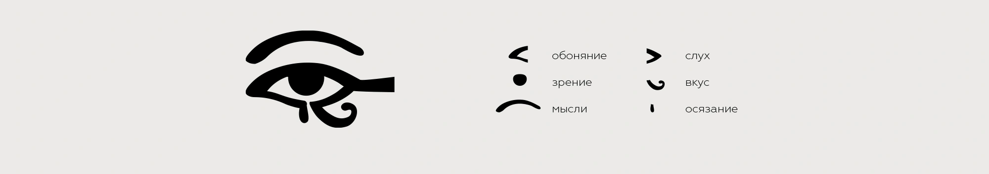 Концепция ресторана представляет собой симбиоз вкуса и впечатлений, это значит, что у гостя будут задействованы все органы чувств. Иллюстрацией этой идеи становится египетский символ – глаз Гора, который разбит на шесть основных компонентов, каждый из которых представляет один из шести органов чувств