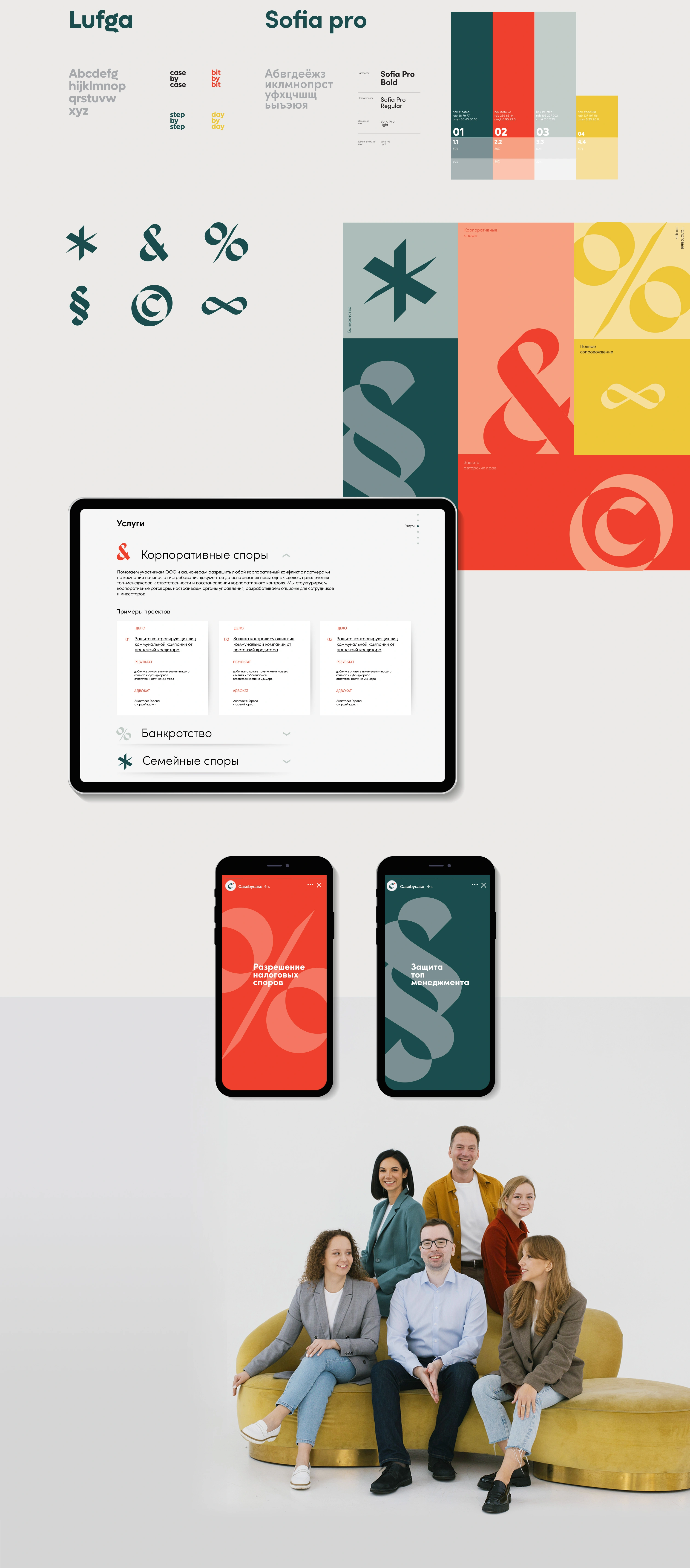 Для клиента был разработан логобук, включающий фирменные шрифты, цвета и набор дополнительных графических элементов в стиле логотипа на основе типографских символов